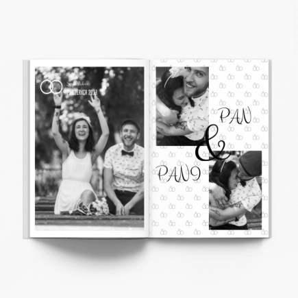 Jak to było? Powiedzieliście sobie sakramentalne „tak” i nałożyliście na palce obrączki. Babcia trochę się wzruszyła, tłum gości obsypał Was ryżem na szczęście i pojechaliście… prawie windą do nieba? A przynajmniej na salę, gdzie rozpoczęła się najpiękniejsza noc w Waszym życiu. Pierwszy toast, pierwszy taniec, wirujące światła i Wasze zakochane spojrzenia. Naprawdę jest co wspominać! Przygotowaliśmy dla Was szablon, dzięki którym stworzycie ślubną fotoksiążkę pełną Waszych wspomnień. Fotoksiążkę jednak nietypową, bowiem w pełni dopasowaną do Waszych charakterów. I tym razem postawiliśmy na mariaż czerni i bieli, ale odeszliśmy od klasycznych motywów. Dodaliśmy za to kilka odważnych akcentów i zabawiliśmy się formą tworząc wzór, który teraz oddajemy do Waszej dyspozycji. Dedykujemy go Wam, bo lubicie nietuzinkowe rozwiązania i niebagatelne pomysły. Zdecydowaliśmy się na smaczne połączenie dwóch kolorów i nowoczesnych grafik, które swoją stylistyką nawiązują do nieśmiertelnego stylu vintage. Przygotujcie album wykorzystując tekturowe tła, pieczątki, ramki i napisy, które nadadzą mu handmade’owego charakteru. Według własnego uznania łączcie zdjęcia, obrazki i tekst tworząc dowolne kompozycje i wykreujcie swoją wymarzoną ślubną fotoksiążkę. Po swojemu!