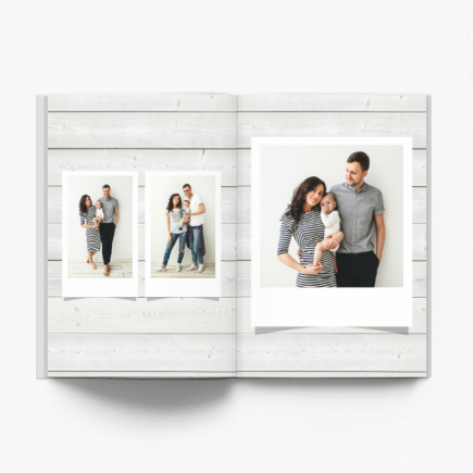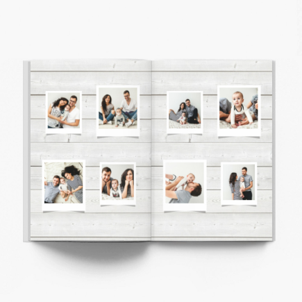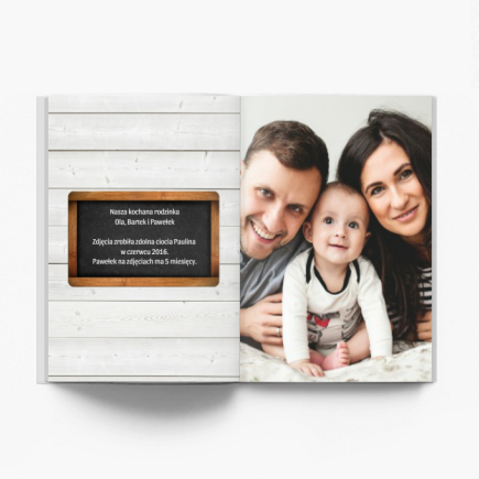 Szablon "Najświeższe wspomnienia" oparty jest na prostych układach zdjęć ułożonych na tle z delikatnych białych desek. Opisy zdjęć możesz umieścić na clipartach imitujących tablicę kredową. Same zdjęcia możesz umieścić w białych ramkach imitujących odbitki z polaroida. Fotoksiążka 28 stron dostępna jest w czterech formatach - 20x20cm, 30x30cm oraz pionowym i poziomym o wymiarach 20x30cm. Nowoczesna technologia umożliwia wydruk na miękkim papierze kredowym o gramaturze 200g/m2 lub sztywnym papierze fotograficznym o gramaturze 800g/m2. Istnieje możliwość wyboru jednego z kilku wariantów okładki – twardej błyszczącej, twardej matowej z miękkim wypełnieniem, materiałowej lub akrylowej.