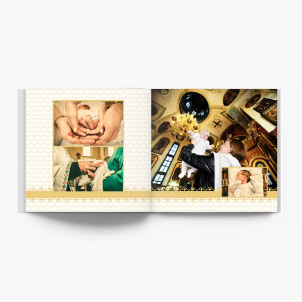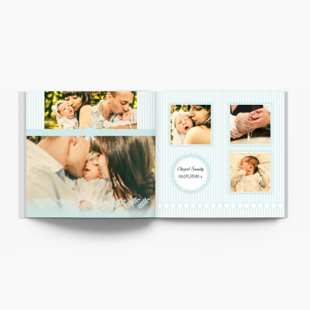 Zestawiliśmy ze sobą delikatne ornamenty i pastelowe kolory, które harmonijnie stworzyły idealne tło dla Waszych fotografii. Blady róż i błękit świetnie skomponują się z fotografiami Waszego maleństwa, a subtelne dekoracje dodadzą im niepowtarzalnego charakteru. Dwa bloki kolorystyczne, które zawarliśmy w tym projekcie, pozwalają stworzyć fotoksiążkę zarówno dla chłopca, jak i dziewczynki. Wybierzcie ulubione zdjęcia z tego uroczystego dnia i zaaranżujcie każdą stronę osobno wykorzystując eleganckie akcenty oparte o motywy florystyczne. Dobierzcie stonowane passe-partout do najważniejszych ujęć, a w odpowiednich miejsca dopiszcie własne komentarze. Ledwie widoczna tekstura w stonowanych barwach przypominająca bokeh, z pewnością ożywi Wasz album dodając mu typowo dziecięcego wymiaru. Przygotujcie uroczy album, który pozwoli Wam niejednokrotnie celebrować wyjątkowe dla Waszej pociechy chwile! A może warto obdarować nim najbliższych, którzy je z Wami dzielili? Dziadkowie i chrzestni z pewnością byliby zachwyceni tak drogocennym prezentem!