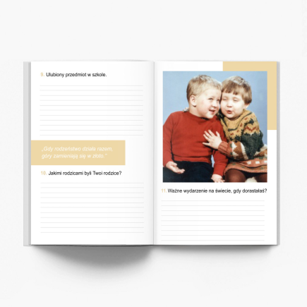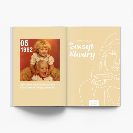 Szablon fotoksiążki “Złote myśli - zeszyt Siostry”. Stwórz wyjątkowy projekt jako pamiątkę dla Ciebie lub prezent dla bliskiej osoby. Wybierz format fotoksiążki, rodzaj papieru oraz okładki, dodaj wybrane zdjęcia i uzupełnij szablon według własnej koncepcji. Każdy projekt możesz dowolnie personalizować poprzez zmianę tła, dodanie napisów i klipartów.