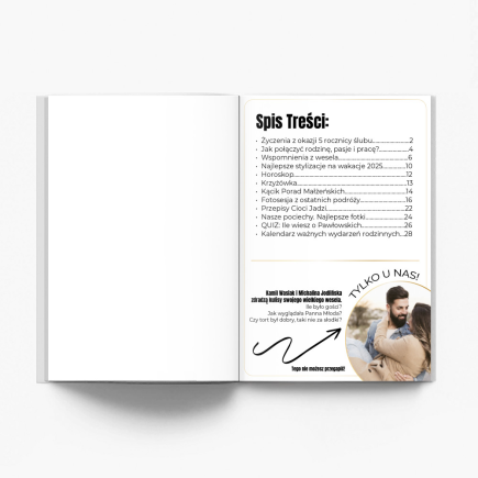 Zamień wspomnienia w wyjątkową opowieść! Nasz magazyn personalizowany łączy elegancję magazynowego designu z emocjonalną wartością Twoich zdjęć. Idealny na prezent, pamiątkę z podróży, reportaż ślubny czy portfolio.