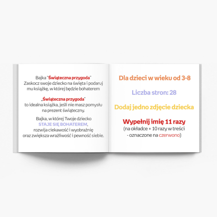 „Świąteczna przygoda” to idealna książka, jeśli nie masz pomysłu na prezent świąteczny. Bajka, w której Twoje dziecko staje się bohaterem, rozwija ciekawość i wyobraźnię oraz zwiększa wrażliwość i pewność siebie.